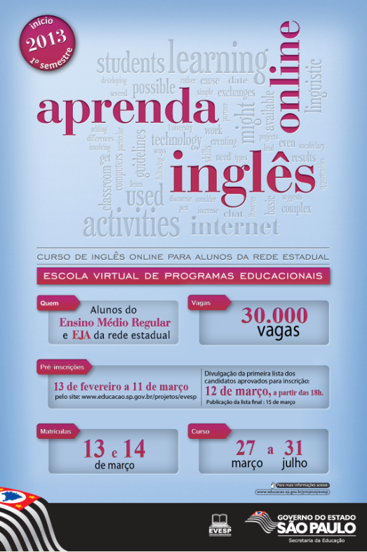 Os alunos da rede estadual interessados em fazer um curso de idioma no próximo semestre podem procurar o Centro de Estudos de Línguas mais próximo. No total, são 224 unidades distribuídas no Estado.